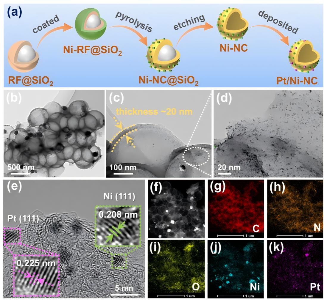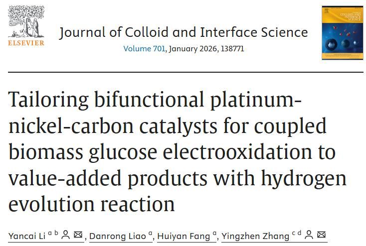 李艳彩教授联合清源创新实验室张颖贞博士后,在《Journal of Colloid and Interface Science》(中科院一区Top期刊)发表最新研究成果,报道了一种具有优异电催化性能的双功能Pt/Ni-NC催化剂,该催化剂在葡萄糖电氧化过程中表现出优异的催化活性和稳定性,同时在阴极侧有效促进析氢反应,实现了电能驱动下的生物质高值化与能源共生产。这一策略打破了传统电解水仅产氢的单一模式,将“废弃生物质”转化为“绿色能源+高附加值化学品”的新途径,为未来可持续能源体系提供了新范式。该催化剂不仅能够高效催化生物质葡萄糖电氧化反应,实现高附加值化学品(乳酸和甲酸)的制备,还能同步促进产氢反应(HER),实现绿色制氢。这项工作为耦合生物质转化与清洁能源生产提供了新的解决方案,展现了“双碳时代”背景下的能源创新方向。通过精确调控Pt与Ni的组分及碳载体结构,制备出高分散的Pt-Ni纳米催化剂。